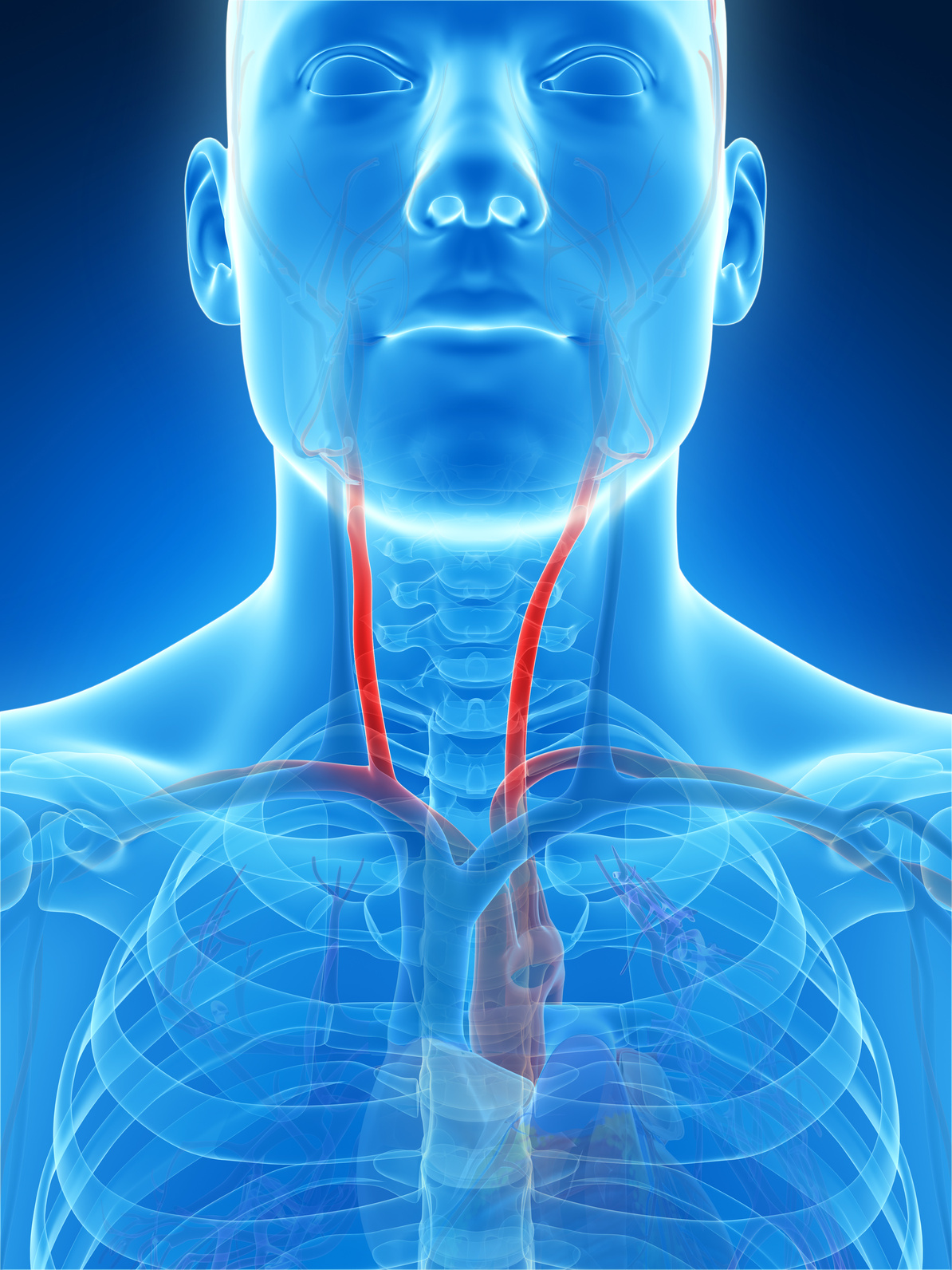Approximately one-third of strokes are caused by carotid occlusive disease, or hardening of the carotid arteries. The carotid arteries supply blood to the brain and any interruption in blood flow can lead to a stroke. Hardening of the arteries is a process known as atherosclerosis. Atherosclerosis is a global process and can affect all arteries of the body. Risk factors for this disease include age, hypertension, family history, smoking, increased cholesterol or lipids, diabetes and renal failure. This is a silent disease process and often provides no warning signs or symptoms prior to a stroke. Symptoms can include arm or leg weakness or numbness, loss of vision in one eye, difficulties with speaking or decreased coordination.