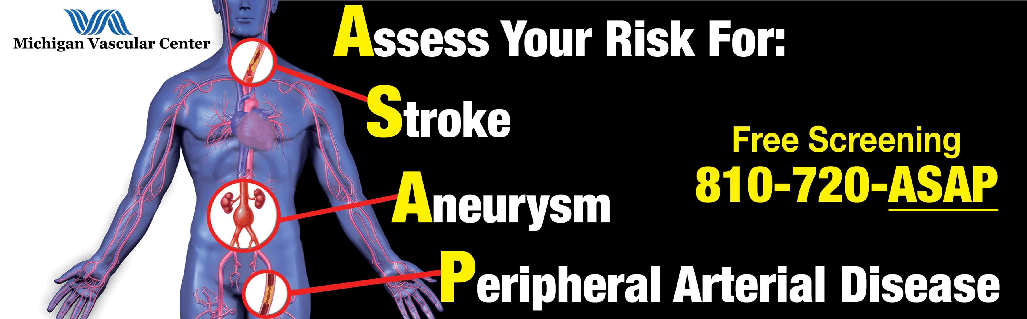 If you are 50 years of age or older with a history of any of the following risk factors: elevated cholesterol, hypertension, coronary artery disease, smoking, renal disease, diabetes or a family history of PAD, please call (810) 720-ASAP (2727) to schedule your confidential free screening and Assess your risk of Stroke, Aneurysm and Peripheral arterial disease.